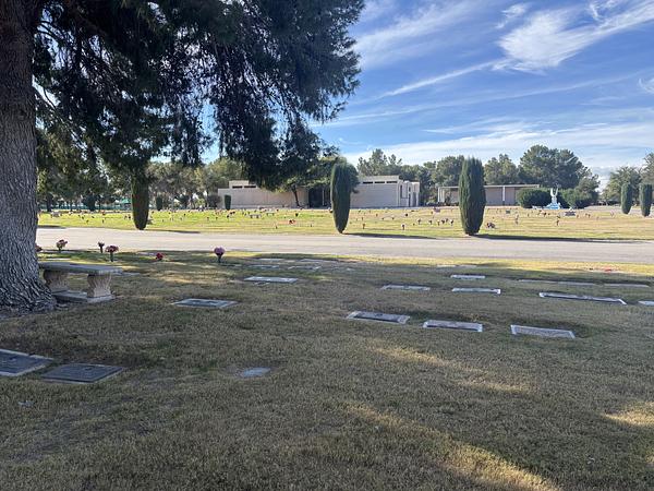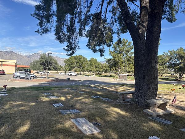 The two plots are in the East Lawn Palms and Mortuary. The are several mature trees nearby. There is also a a bench that was donated by my grandmother near these plots.