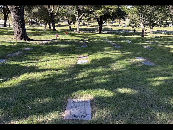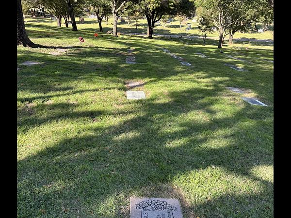 This is a single depth burial plot that can hold one casket or four urns. It is located in a grassy area with large mature oaks providing shade nearby.