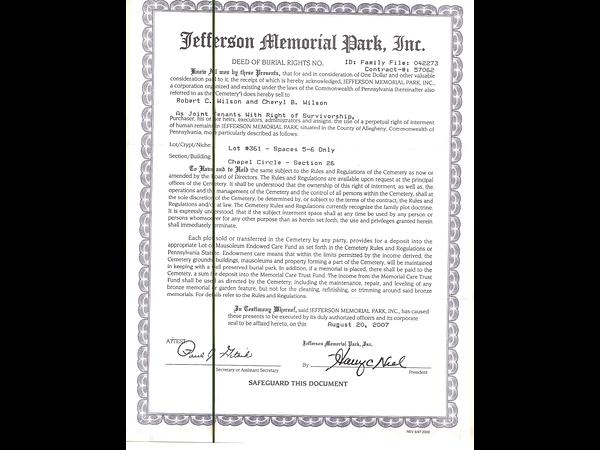 $2,800 burial plot in Jefferson Memorial Cemetery