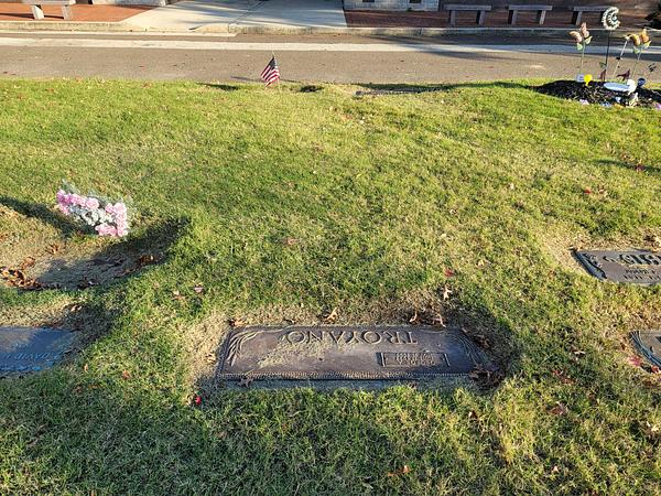 Upon entering Locustwood, proceed to the traffic circle at the center of the cemetery. Take the road along the left (west) side of the Mausoleums. Stop about three-quarters of the way along the Mausoleum and look for the troyano marker. The markers at Locustwood are placed at the foot of each grave, preserving the natural beauty of the landscape. When standing where your new markers would be, the gravesites are directly ahead of you when facing the Mausoleum—second row in from the road.