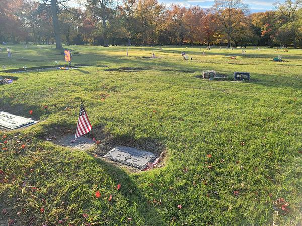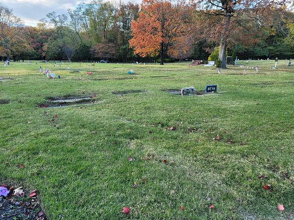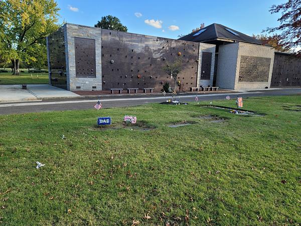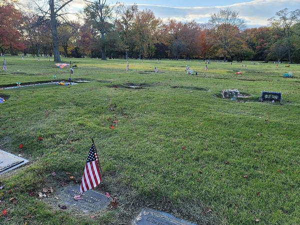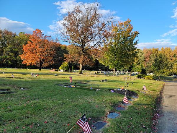 The plots are surrounded by mature trees, manicured landscaping, and a peaceful view of a distant wooded area, offering a sense of privacy and tranquility. This quiet, sun-filled location provides a fitting and comforting setting to honor and remember loved ones together.