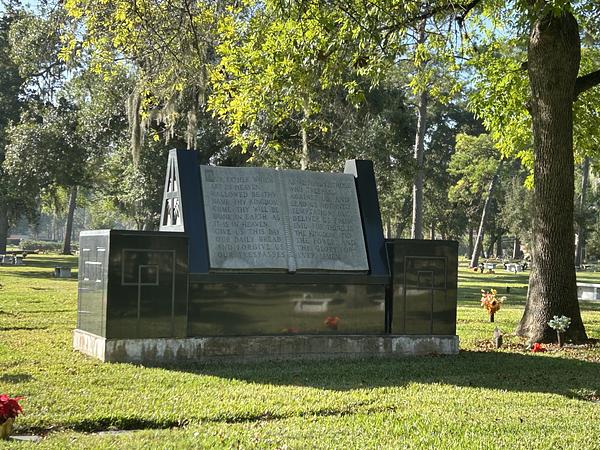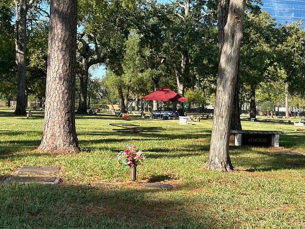 The two plots are located in a tranquil area of a beautiful highly rated full service cemetery in Houston Texas. Easy access from Highway I-10 the plots are relatively close to the entrance of the cemetery. The plots face east, surrounded by beautiful trees with an excellent view of the open bible. The cemetery is beautifully maintained. The chapel is close by with easy access to the plots. In the accompanying pictures the center of the two plots is marked by a plot marker with a circle around it. The current price per lot starts at $19,995. These two lots are an extremely good value.