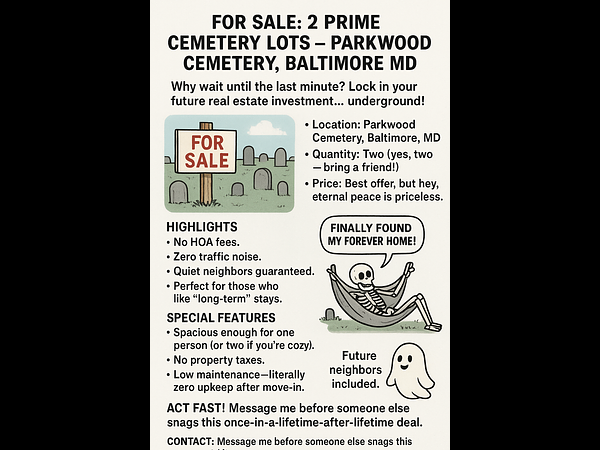 Let’s be honest. This isn’t a purchase for today; it’s a purchase for when you’re no longer a problem for anyone else. I have two premium plots at PARKWOOD CEMETERY, Baltimore, MD. I’m offering you a chance to secure your future for less than the market price! Parkwood Cemetery plots are so popular, they have a waiting list! This prime piece of earth is located in the beautiful, serene Good Shepherd section and has an incredible view of... well, sky and a gorgeous pond! Come and see why so many people are dying to join our community!