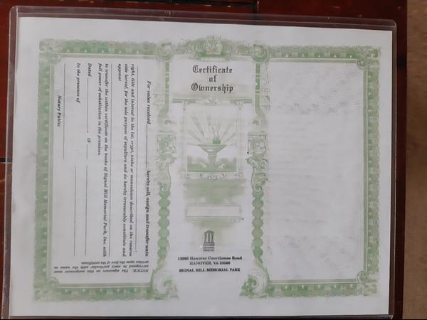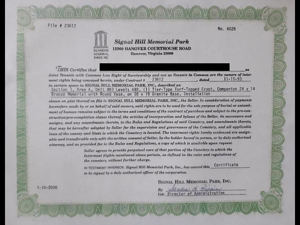 Hanover, VA 23069. Section 1, Area A, Unit 483, levels A & B, two tiered, upper and lower chamber, turf-topped crypt. It includes a 24" x 14" bronze memorial with a round vase, a 28" x 18" granite base, and installation which all transfer with the sale. The bronze memorial allows for year of birth/year of death for both parties, 4 words, and 2 emblems. It is located in close proximity to the Veteran's Memorial and the building A Crypt. The double vault currently sells for $15,995 and the bronze memorial and other amenities are priced at $4095. The $14000.00 price includes the transfer fee of $995. The attached photos were taken recently during the wintertime. The circled areas on the photos shows the actual vault location. I have attached a link to the Signal Hill's website which shows the cemetery when everything is lush and green.