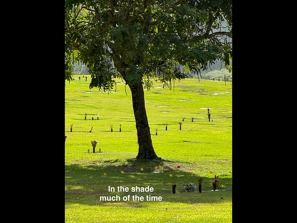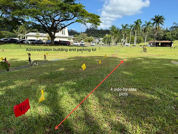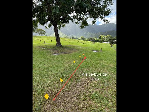 There are 4 side-by-side plots located in the Eternal Love section with easy access from the parking lot in front of the Administration building. The plots are on level ground, a short walk of approximately 100 feet from the parking lot. They are shaded most of the day by a large tree. Each plot accommodates 2 urns or 1 casket. The market value for each plot is $17,500.